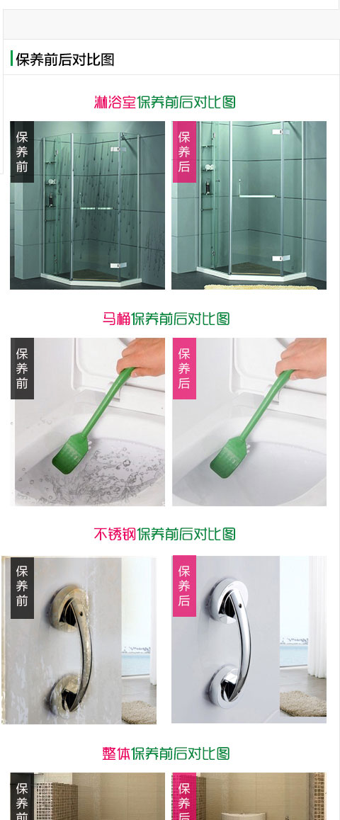 墻體無色差、無明顯污漬、無涂料點、無膠跡、潔具潔凈光亮、不銹鋼管件光亮潔凈、地面無死角、無遺漏、無異味。