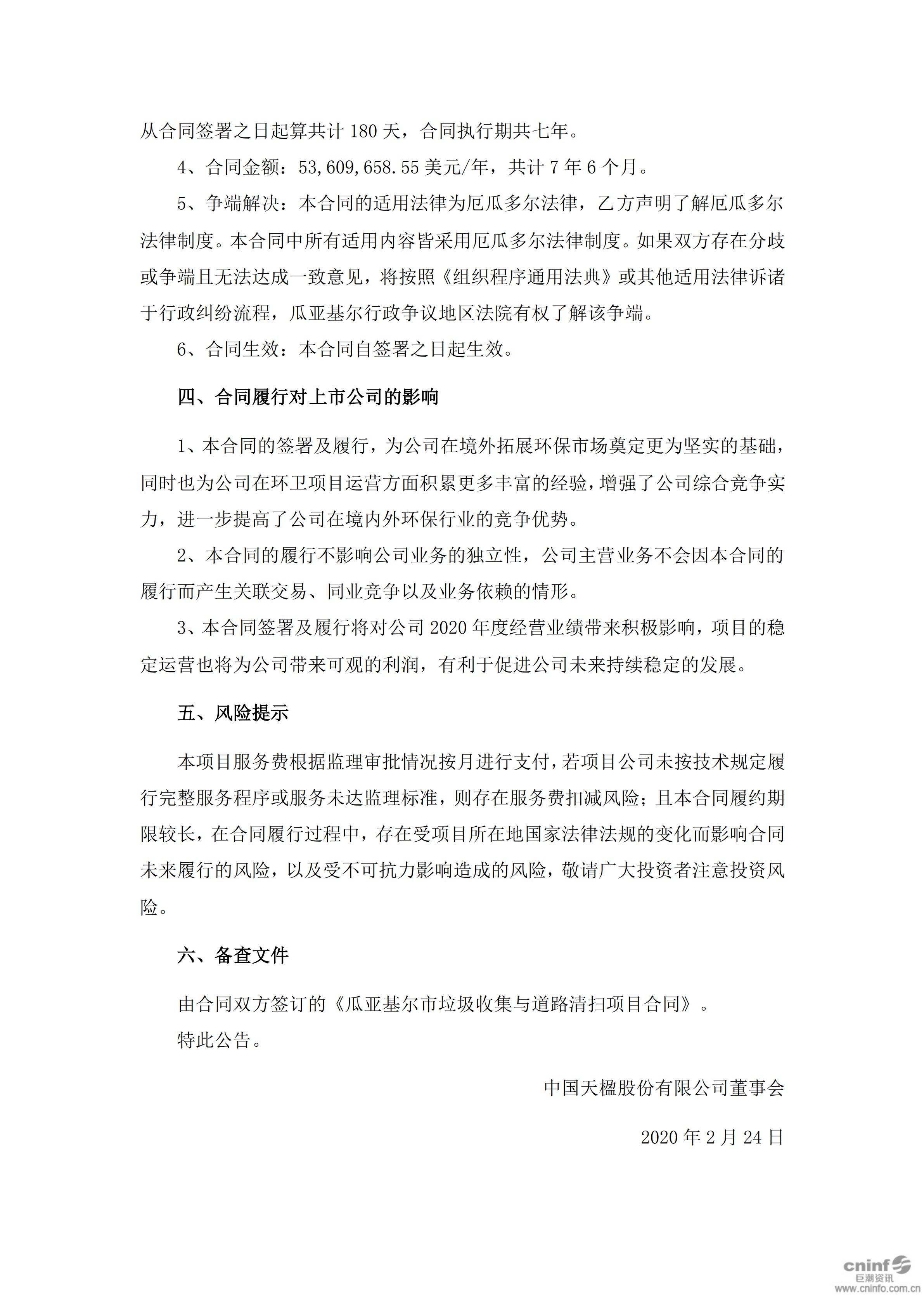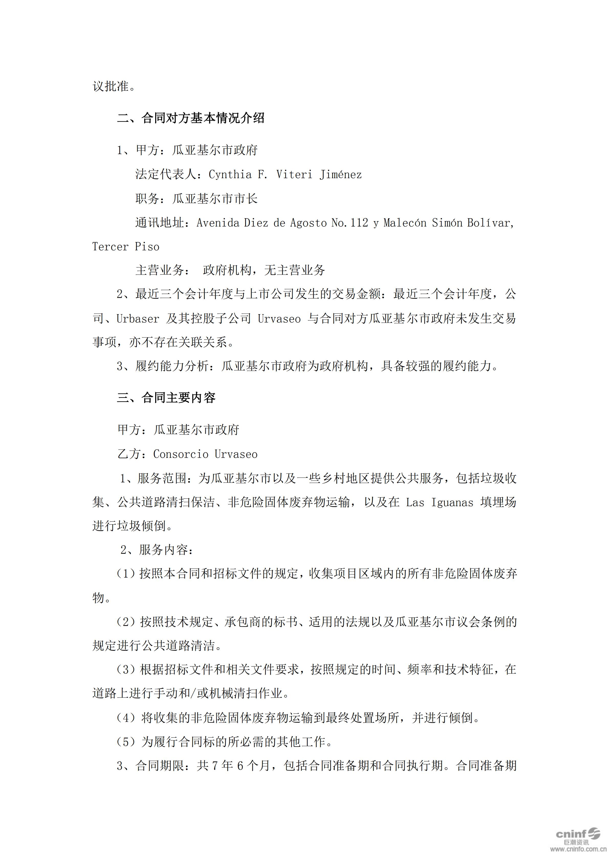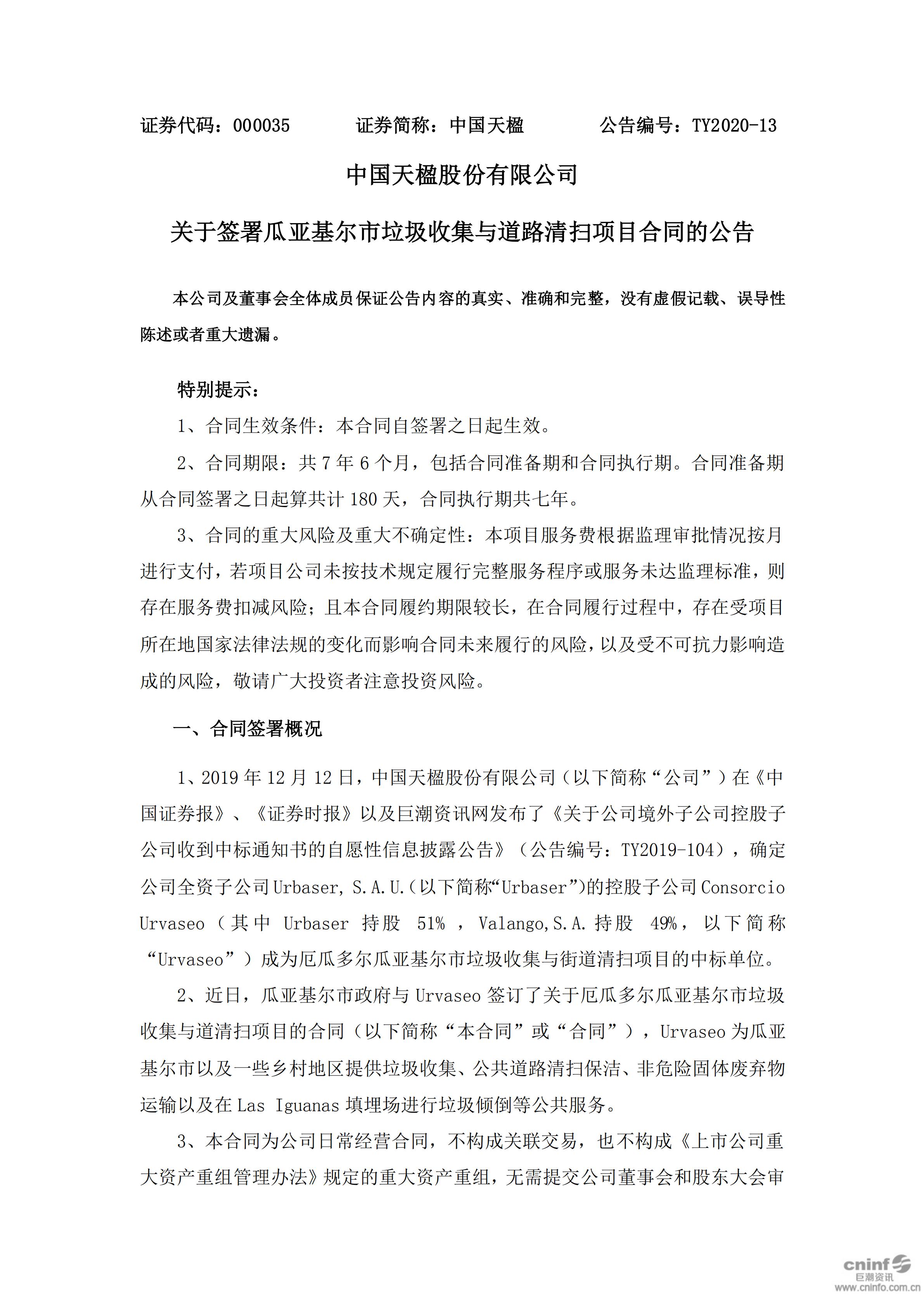 中國天楹:關(guān)于簽署瓜亞基爾市垃圾收集與道路清掃項(xiàng)目合同的公告